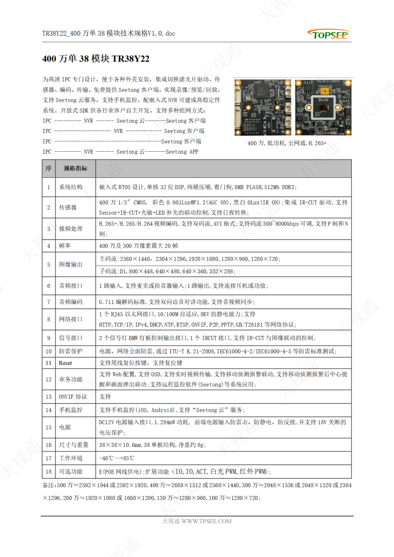 集成了IPC傳感器、圖像處理芯片及其他相關電路模塊化組件,提供全天候的高清監控畫面,適配各種外殼安裝,靈活適用于室內外的各種復雜環境。同時免費提供Seetong手機/電腦客戶端,實現畫面預覽/錄像回放/智能告警等多種監控服務。